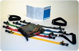 The resistance of each band can be increased or decreased by adjusting the band length. In addition to the two band length adjustment clips, each band has two "quick-attachment" hooks. These hooks attach to the D-ring on the handle and strap accessories. This unique arrangement even allows two or more bands to be used together. Available in kits containing bands, two handles, a 25" leg attachment strap (can also be used as an anchor), and an illustrated exercise card. Caution: This product contains natural rubber latex which may cause allergic reactions.