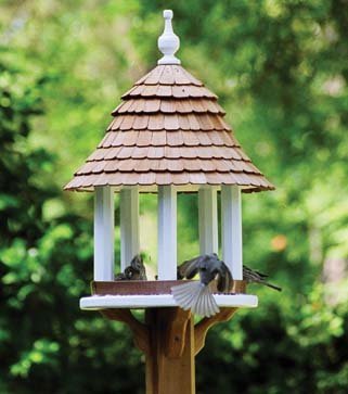 Lazy Hill Feeder A Bird's Favorite! Birds love the spacious feeding area, which is protected from rain and snow. You'll have to stock up on birdseed since Birds love this feeder so much. The copper band helps contain the seed and creates an attractive accent.. The roof is made of cedar and the body is a solid cellular vinyl, a wood alternative, which gives you the look and feel of wood with little maintenance. Made in Maine. Painted White with Cedar Shingles Dimensions: 17" Diameter x 23 1/2" Tall Made of Solid Cellular Vinyl Made in the USA Ships Fast! About the Manufacturer, Lazy Hill: Lazy Hill Farm Designs has been designing architectural ornaments for gardens for over twenty years. As homeowners want to create elements of beauty to their outdoor living space, Lazy Hill is ready to offer them the perfect accessories to complement their homes. Lazy Hill have always been known for our exceptional quality and continue to stand by our products. They continue to use premium select weather-resistant woods that age beautifully outdoors. Their specialty product line of mailbox posts, lantern posts, planters and window boxes are all hand-crafted in the state of Maine.